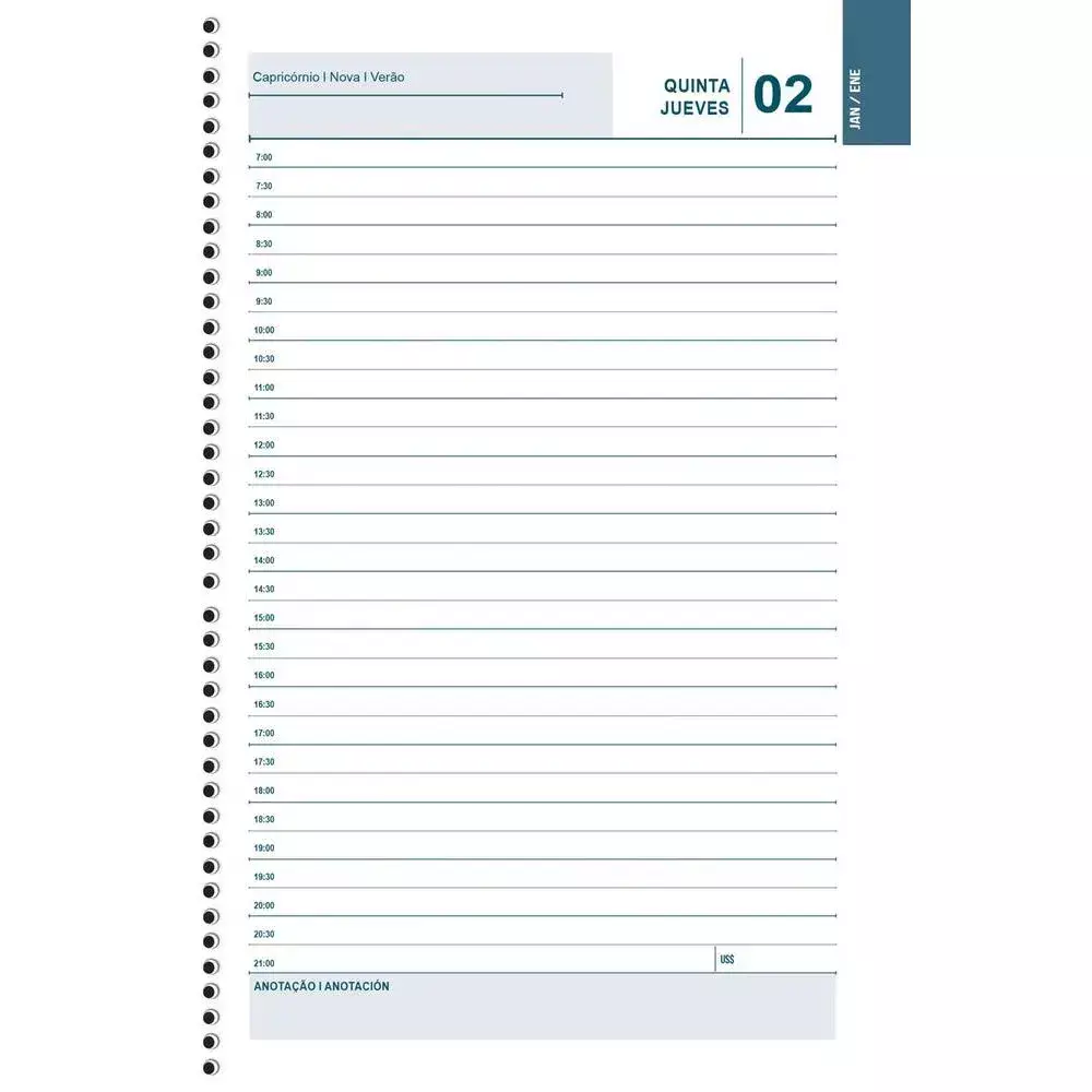 Capa Dura; 2 opções de cores; Verniz Localizado; Espiral; Anual 1 dia por página; Horário das 7h as 21h; Marcação 30-30 minutos; Papel 63gr. Tamanho: 138mmx206mm. 192 folhas. ref. antiga: 130001.